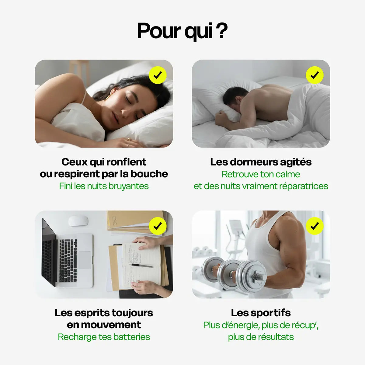 En dormant avec une respiration plus efficace, tu évites l’hypoxie légère et les micro-réveils souvent causés par la respiration buccale. Tu te lèves avec un esprit alerte, une meilleure humeur et une énergie stable pour la journée.